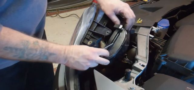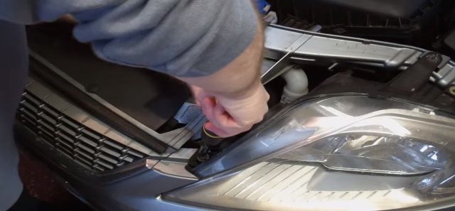Сначала надо снять фару — открутить пару винтов, затем черный фиксатор (пистон пластиковой морды). Затем аккуратно снять фару с посадочного места и перевернуть, чтобы можно было добраться к лампам сзади. Вытаскивание фары будет самым сложным этапом и у многих владельцев Ford Mondeo вызывает затруднения. Поэтому открутив винты подтягиваете фару в сторону бампера, затем пытаетесь вытащить дальний край фары (делаем очень аккуратно, можно сколоть кончик крыла, особенно при установке назад). Далее надо снять заглушку и вытащить нужную лампу вместе с разъемом из фары.