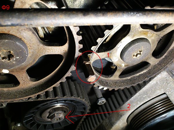 - Включите пятую передачу и крутите колесо при помощи монтировки пока метки не совпадут. Иногда бывает так, что меток просто нет, в таком случае их необходимо сделать самим. Для этого подойдет пилочка по металлу или керно. Далее необходимо найти ВМТ 1-го цилиндра и нанести метки как показано на фото.