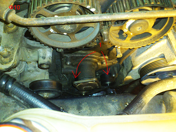 - Снимите фишку с трубки гидроусилителя, которая проходит прямо над верхней крышкой ремня ГРМ, после чего открутите болт с гайкой.