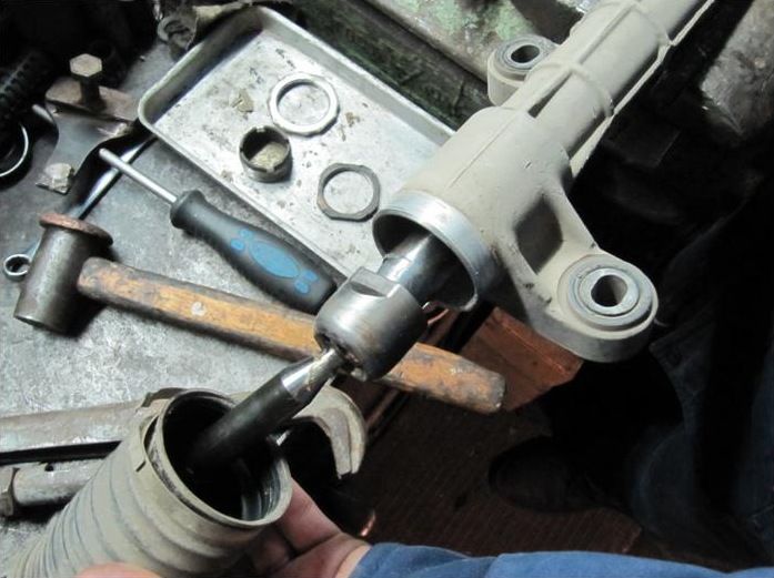 Затем снимаем стопорное кольцо, откручиваем гайку и выбиваем вал, затем, чтобы снять саму рейку нужен спец ключ. У меня его не было, я откручивал подручными средствами, поэтому немного помял центрирующую шайбу. Пришлось поработать напильником.
